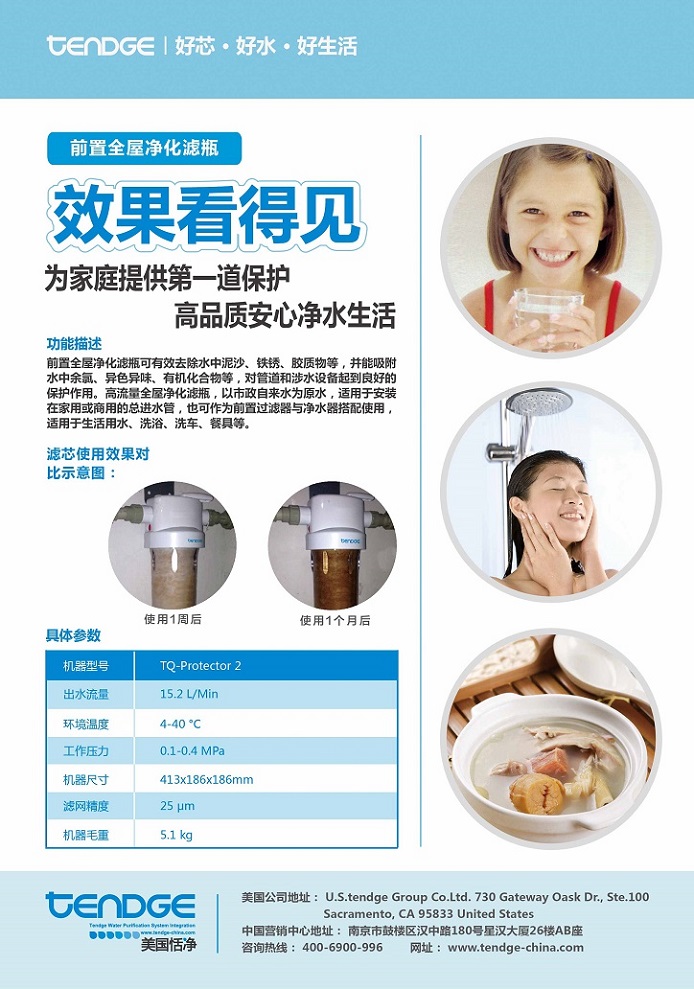 恬凈前置全屋凈化濾瓶TQ-P2能有效去除水中的懸浮物、鐵銹、顆粒雜質、余氯、異色異味,它采用FDA食品級材質,高精度過濾濾芯,體積小巧,安裝方便。恬凈前置全屋凈化濾瓶TQ-P2能承受高水壓,流量超大,智能濾芯提醒功能,節能環保。
